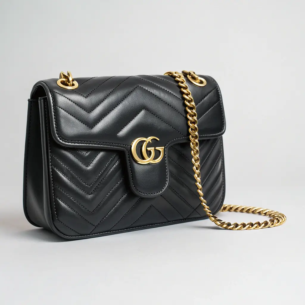 The Gucci Marmont Shoulder Bag features a chevron quilted velvet exterior with aged gold-tone GG hardware. Its compact size makes it ideal for evening outings, while the chain strap adds a luxurious touch. The interior is lined with microfiber and includes a small pocket for essentials. This bag embodies contemporary elegance with a vintage-inspired vibe.
